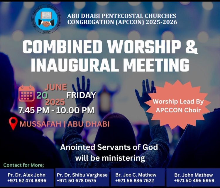 അബുദാബി: അബുദാബി പെന്തെക്കോസ്തൽ ചർച്ചസ് കോൺഗ്രിഗേഷൻ 2025 - 26 ( APCCON ) പ്രവർത്തനോദ്ഘാടനവും സംയുക്ത ആരാധനയും ജൂൺ 20 വെള്ളിയാഴ്ച വൈകിട്ട് 7.45 മുതൽ അബുദാബി മുസഫയിൽ നടക്കുും.