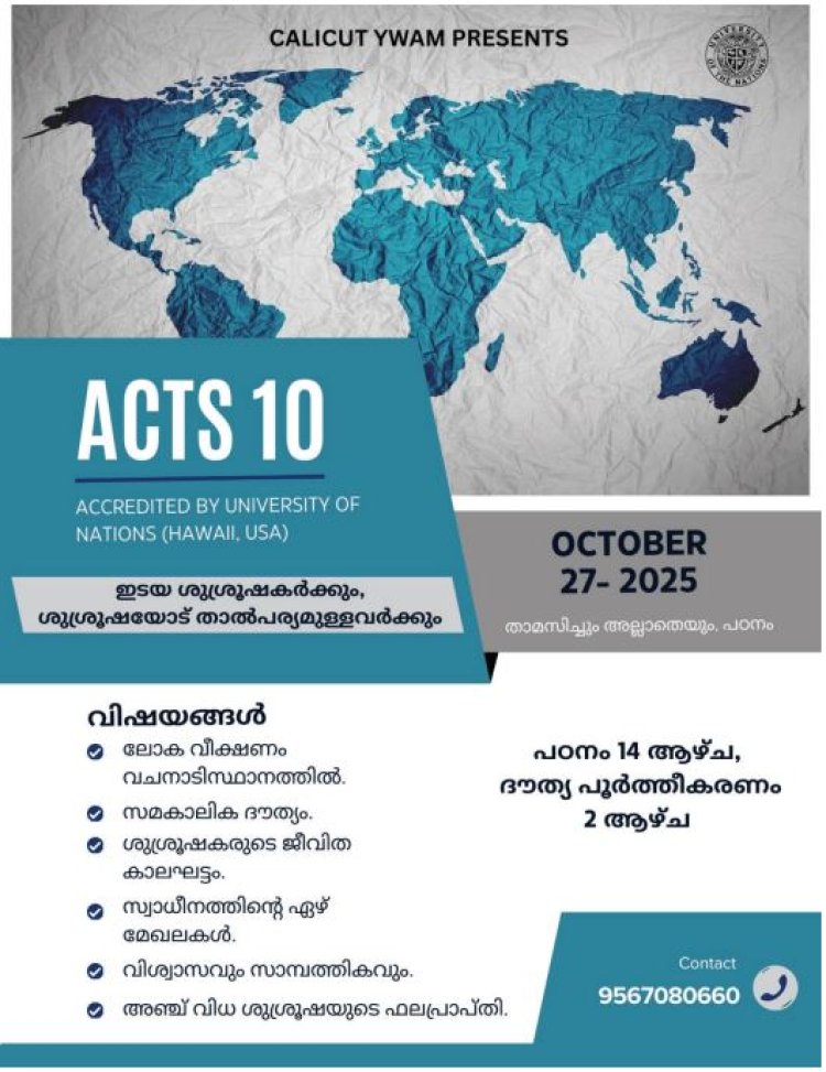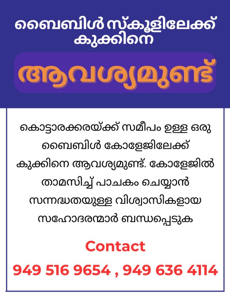 പാസ്റ്ററുടെ മകനും നിലവിൽ പൂർണ്ണ സമയ സഭാ ശുശ്രുഷകനും ബൈബിൾ കോളേജ് അധ്യാപകനുമായി എറണാകുളത്ത് കർത്തൃവേലയിലായിരിക്കുന്ന യുവാവിന് (29 / 6.1"), പൂർണ്ണ സമയ ദൈവവേലയ്ക്ക് വിളിയും സമർപ്പണവുമുള്ള യുവതികളുടെ മാതാപിതാക്കളിൽ നിന്നും വിവാഹാലോചനകൾ ക്ഷണിക്കുന്നു. Contact: +91 85471 73395 (WhatsApp) Email details to: prkjfrancis@gmail.com