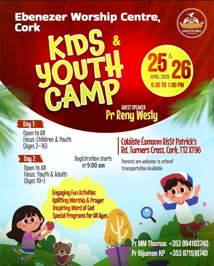 അയർലൻഡ് : കിഡ്സ് യൂത്ത് ക്യാമ്പ് ഏപ്രിൽ 25 മുതൽ 26 വരെ അയർലൻഡ് എബനേസർ വർഷിപ്പ് സെന്റർ കോർക്കിൽ നടക്കും. പാസ്റ്റർ റെൻസി വെസിലി ക്ലാസുകൾ നയിക്കും. പാസ്റ്റർ എം.എം തോമസ് പാസ്റ്റർ ബിജു കെ. പി തുടങ്ങിയവർ നേതൃത്വം വഹിക്കും .
