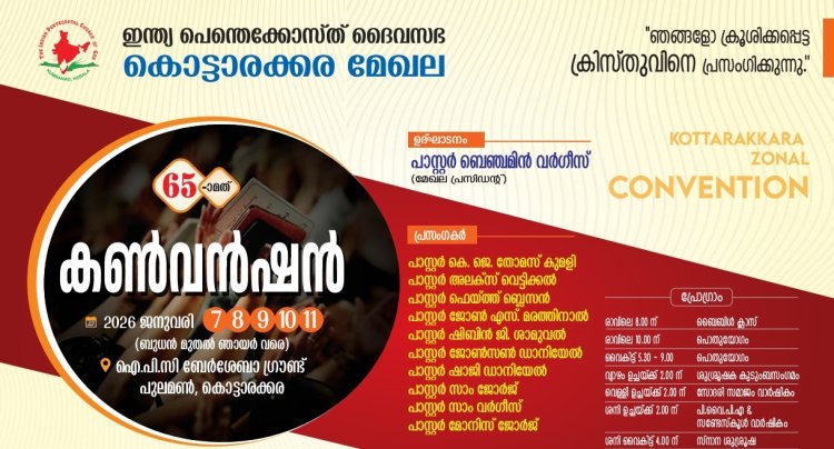ഐപിസി കൊട്ടാരക്കര സെൻ്റർ പ്രസിഡൻ്റ് പാസ്റ്റർ എ.ഒ തോമസ് കുട്ടി അദ്ധ്യക്ഷനായിരുന്നു. പാസ്റ്റർ ജോസ് മാതൃൂ സങ്കീർത്തനം വായിക്കുകയും മേഖല ജോ. സെക്രട്ടറി ഫിന്നി പി മാത്യു സ്വാഗതം അറിയിക്കുകയും ചെയ്തു.