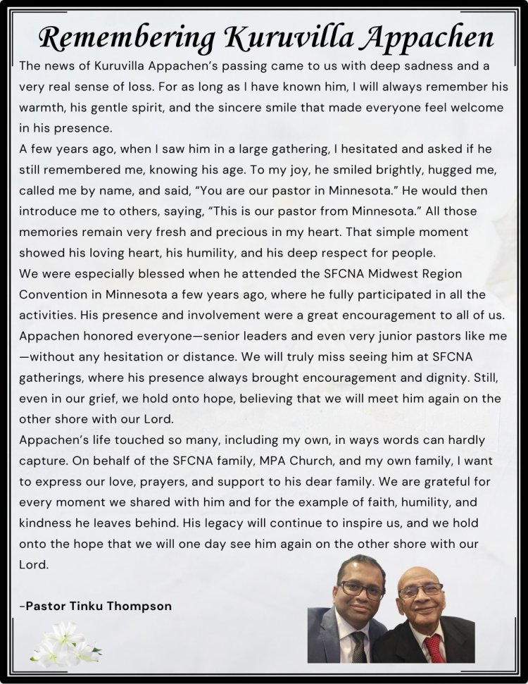 ഏതാനും വർഷങ്ങൾക്ക് മുമ്പ് മിനസോട്ടയിൽ നടന്ന SFCNA മിഡ്വെസ്റ്റ് റീജിയൻ കൺവെൻഷനിൽ അദ്ദേഹത്തെപ്പോലെ സീനിയർ ആയ ദൈവദാസൻ പങ്കെടുത്തപ്പോൾ ഞങ്ങൾക്കുമത് പ്രത്യേക അനുഗ്രഹം ആയി. അവിടെ അദ്ദേഹം എല്ലാ സെഷനുകളിലും പൂർണ്ണമായി പങ്കെടുത്തു. അദ്ദേഹത്തിന്റെ സാന്നിധ്യവും പങ്കാളിത്തവും ഞങ്ങൾക്കെല്ലാവർക്കും വലിയ പ്രോത്സാഹനമായിരുന്നു. അപ്പച്ചൻ എല്ലാവരെയും - മുതിർന്ന നേതാക്കളെയും എന്നെപ്പോലുള്ള വളരെ ജൂനിയർ പാസ്റ്റർമാരെയും പോലും - യാതൊരു മടിയും അകലവും കൂടാതെ ആദരിച്ചു. അദ്ദേഹത്തിന്റെ സാന്നിധ്യം എപ്പോഴും പ്രോത്സാഹനവും അന്തസ്സും നൽകുന്ന SFCNA ഒത്തുചേരലുകളിൽ അദ്ദേഹത്തെ കാണുന്നത് ഞങ്ങൾക്ക് ശരിക്കും നഷ്ടമാകും. എന്നിരുന്നാലും, ഞങ്ങളുടെ ദുഃഖത്തിൽ പോലും, മറുകരയിൽ നമ്മുടെ കർത്താവിനൊപ്പം അദ്ദേഹത്തെ വീണ്ടും കാണുമെന്ന് വിശ്വസിച്ചുകൊണ്ട് ഞങ്ങൾ പ്രത്യാശ മുറുകെ പിടിക്കുന്നു.