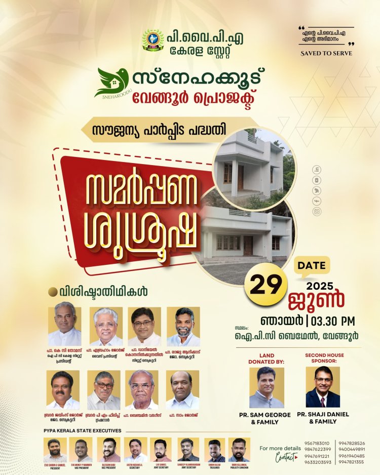 പി.വൈ.പി.എ. കേരളാ സ്റ്റേറ്റ് വേങ്ങൂർ സ്നേഹക്കൂട് സമർപ്പണം ജൂൺ 29 ഇന്ന് വൈകിട്ട്