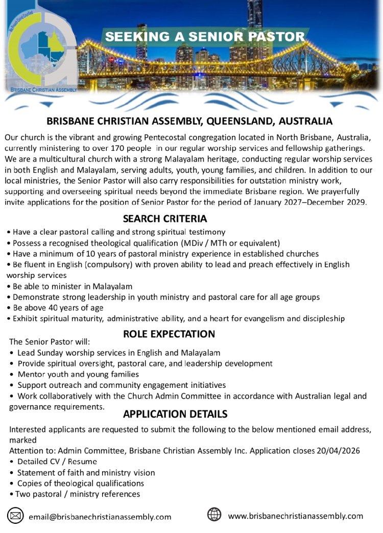 SEEKING A SENIOR PASTOR; BRISBANE CHRISTIAN ASSEMBLY, QUEENSLAND, AUSTRALIA