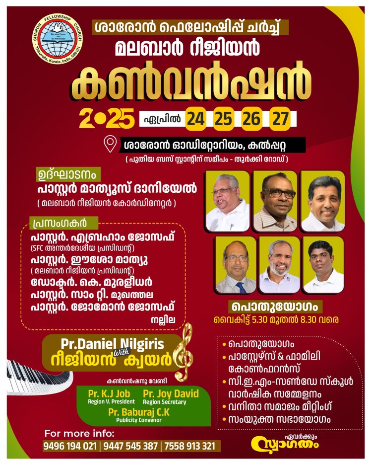 ശാരോൻ ഫെലോഷിപ്പ് ചർച്ച് മലബാർ റീജിയൻ കൺവെൻഷൻ ഏപ്രിൽ 24 നാളെ മുതൽ