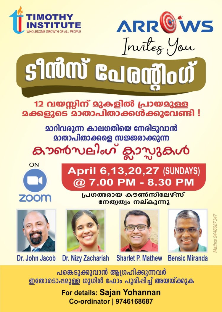 12 വയസിനു മുകളിൽ പ്രായമുള്ള മക്കളുള്ള മാതാപിതാക്കന്മാർക്കായി പ്രത്യേകം തയ്യാർ ചെയ്തിരിക്കുന്ന ഈ പ്രോഗ്രാമിൽ പങ്കെടുക്കുവാൻ ആഗ്രഹിക്കുന്നവർ മുൻ കൂട്ടി പേര് രജിസ്റ്റർ ചെയ്യേണ്ടതാണ്. രജിസ്ടേഷൻ തികച്ചും സൗജന്യമാണ്. രജിസ്റ്റർ ചെയ്യുന്നവർക്ക് സൂം ID നേരിട്ട് അയച്ചു തരുന്നതായിരിക്കും.