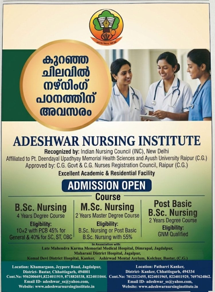 കുറഞ്ഞ ചിലവിൽ നഴ്നിംഗ് പഠനത്തിന് അവസരം; ADESHWAR NURSING INSTITUTE, CHHATTISGARH