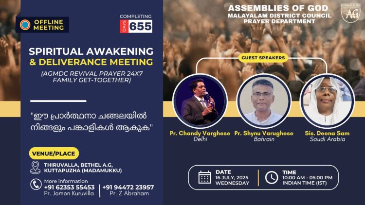 തിരുവല്ല: അസംബ്ലീസ് ഓഫ് ഗോഡ് മലയാളം ഡിസ്ട്രിക്ട് പ്രയർ ഡിപ്പാർട്ട്മെൻ്റിൻ്റെ ആഭിമുഖ്യത്തിൽ തിരുവല്ലയിൽ ഏകദിന ഉണർവ് യോഗവും വിടുതൽ ശുശ്രുഷയും തിരുവല്ല കുറ്റപ്പുഴ മാടമുക്കിലുള്ള ബഥേൽ അസംബ്ലീസ് ഓഫ് ഗോഡ് സഭയിൽ നടക്കും. ജൂലൈ 16 ബുധൻ രാവിലെ 10 മുതൽ വൈകിട്ട് 5 വരെയാണ് യോഗം നടക്കുന്നത്.