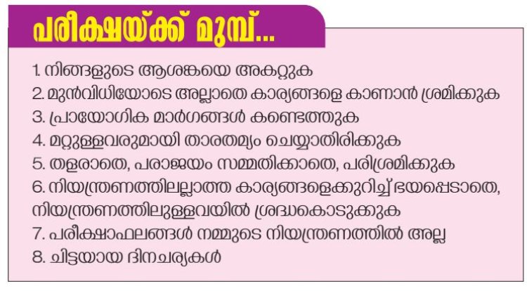 - നിയന്ത്രണത്തിലല്ലാത്ത കാര്യങ്ങളെക്കുറിച്ച് ഭയപ്പെടാതെ, നിയന്ത്രണത്തിലുള്ളവയിൽ ശ്രദ്ധകൊടുക്കുക: പരീക്ഷ കാലത്ത് നെഗറ്റീവ് ചിന്തകൾ വരുന്നത് സാധാരണമാണ്. എന്നാൽ, അതിൽ അകപ്പെടാതെ, നമ്മുടെ നിയന്ത്രണത്തിലുള്ള പ്രവർത്തികളിലേക്ക് ശ്രദ്ധ തിരിക്കുകയും ചെയ്യേണ്ടതാണ്.