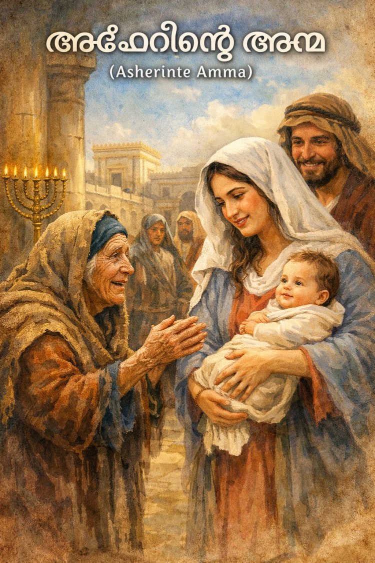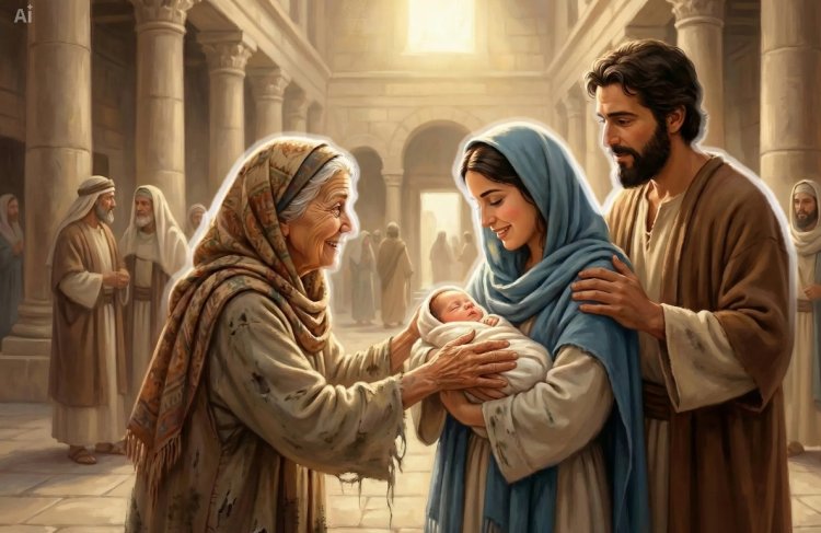 ഒരു ദിവസം, ഈ വൃദ്ധയായ മാതാവ് തന്റെ ശാന്തമായ ദൈവീക ധ്യാനത്തിൽ ഏർപ്പെടുവാൻ തുടങ്ങുമ്പോൾ, ഗലീലിയൻ പട്ടണമായ നസറെത്തിൽ നിന്നുള്ള ഒരു ലളിതമായ ദമ്പതികൾ ദേവാലയത്തിലേക്ക് നടന്നുവരുന്നത് അവളുടെ ശ്രദ്ധയിൽപ്പെട്ടു. കാഴ്ചയ്ക്ക് ഏറെ എളിമയുള്ളവർ, ലളിത വസ്ത്രധാരണം. അതിലേറെ വിനയമുള്ള പെരുമാറ്റം , സ്ത്രീയുടെ കൈയിൽ ചെറിയൊരു കൈക്കുഞ്ഞ്, ഭർത്താവിൻറെ കയ്യിൽ ഒരു ഇണ കുറും പ്രാവ്, വഴിപാട് അർപ്പിക്കുവാൻ വന്നതെന്ന് തോന്നുന്നു. അന്നത്തെ വഴിപാടിന് എത്തിച്ചേർന്നവരുടെ കയ്യിൽ എല്ലാം കൊഴുത്തു തടിച്ച ആട്ടിൻ കൊറ്റാൻ ഉണ്ടായിരുന്നു. ഒറ്റനോട്ടത്തിൽ ഇതൊരു ദരിദ്ര കുടുംബം എന്ന് ആർക്കും ഊഹിച്ചെടുക്കാവുന്ന ബാഹ്യരൂപം. കുഞ്ഞിന്റെ അമ്മയായ ആ സ്ത്രീ വളരെ ചെറുപ്പവും സൗമ്യതയുള്ളവളായി ആർക്കും തോന്നിപ്പോകുന്ന രൂപം. അവളുടെ കണ്ണുകൾ അവളുടെ സാഹചര്യങ്ങളെ മറികടക്കാൻ ശ്രമിക്കുന്ന ശാന്തതയാൽ നിറഞ്ഞിരുന്നു. ആ പുരുഷൻ, അവളുടെ ഭർത്താവ്, അവളുടെ അരികിൽ തന്നെ നിൽപ്പുണ്ട്. അവന്റെ മുഖത്ത് അഭിമാനവും ആഴമായ ഉത്തരവാദിത്തവും കലർന്നിരുന്നു. മോശയുടെ ന്യായപ്രമാണം നിർദ്ദേശിക്കുന്നതുപോലെ, ശുദ്ധീകരണത്തിന്റെയും അവരുടെ ആദ്യജാത മകന്റെ