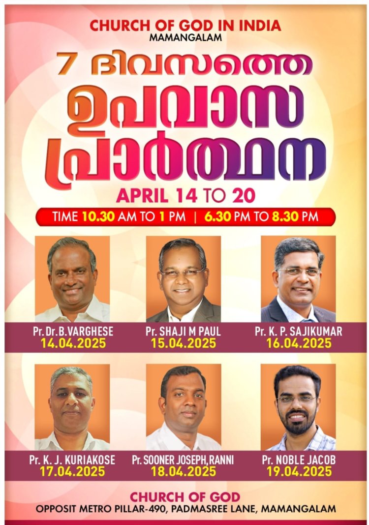 ചർച്ച് ഓഫ് ഗോഡ് മാമംഗലം സഭയിൽ ഏഴ് ദിവസത്തെ ഉപവാസ പ്രാർഥന ഏപ്രിൽ 14 മുതൽ