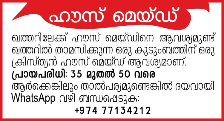 ഖത്തറിലേക്ക് ഹൗസ് മെയ്ഡിനെ ആവശ്യമുണ്ട്