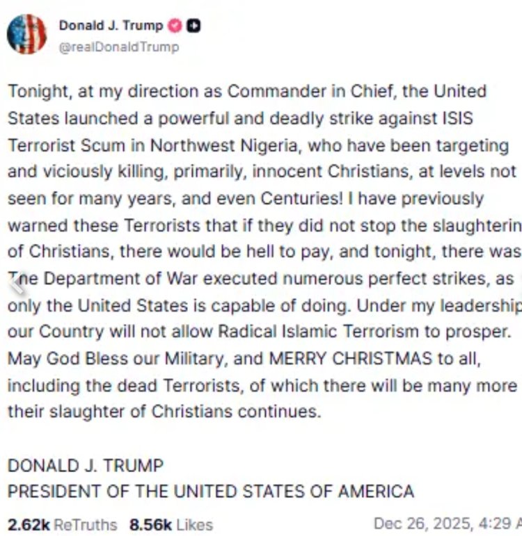 നൈജീരിയയിൽ ക്രിസ്ത്യാനികൾക്കെതിരെയുള്ള അക്രമം വർഷങ്ങളായി വർദ്ധിച്ചുവരികയാണെന്ന് ട്രംപ് ആരോപിച്ചു. ക്രിസ്ത്യാനികളെ കശാപ്പ് ചെയ്യുന്നത് അവസാനിപ്പിക്കണമെന്ന് താൻ നേരത്തെ ഭീകരർക്ക് മുന്നറിയിപ്പ് നൽകിയിരുന്നതായും അദ്ദേഹം കൂട്ടിച്ചേർത്തു. തന്റെ നേതൃത്വത്തിൽ രാജ്യം തീവ്രവാദത്തെ വളരാൻ അനുവദിക്കില്ലെന്നും അമേരിക്കൻ സേനയുടെ കരുത്ത് തെളിയിക്കുന്നതാണ് ഈ നീക്കമെന്നും ട്രംപ് പറഞ്ഞു. യു.എസ് സൈന്യത്തിന് മാത്രം സാധിക്കുന്ന കാര്യമാണ് നൈജീരിയയിലെ ആക്രമണമെന്നാണ് ട്രംപ് അവകാശപ്പെട്ടത്.