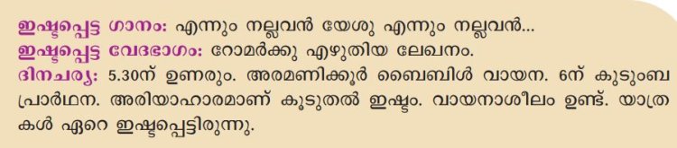ഭൂതകാലസംഭവങ്ങള് ഓരോന്നായി ഓര്ത്തെടുക്കുമ്പോള് ഹൃദയത്തിലെ അടങ്ങാത്ത ആവേശം ആ മുഖത്തു നിഴലിക്കുന്നുണ്ടായിരുന്നു. വിശ്വാസ ജീവിതത്തില് പിന്നിട്ട വര്ഷങ്ങള് അയവിറക്കുമ്പോഴുള്ള ആവേശം ശരീരഭാഷയിലും പ്രകടമായിരുന്നു. അക്ഷരനഗരിയിലെ പെന്തെക്കോസ്ത് ചരിത്രം വിവരിക്കുമ്പോള് ഇനിയും അണയാത്ത സുവിശേഷാത്മാവ് വാക്കുകളില് നിറഞ്ഞുനിന്നു.