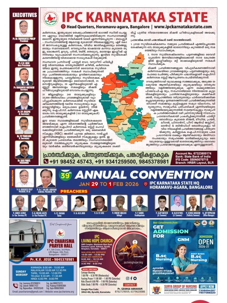 ബെംഗളൂരു: ഇന്ത്യാ പെന്തെക്കൊസ്ത് ദൈവസഭ (ഐപിസി ) കർണാടക സ്റ്റേറ്റ് 39-ാമത് വാർഷിക കൺവൻഷൻ ജനുവരി 29 ഇന്ന് മുതൽ ഫെബ്രു. 1 ഞായർ വരെ ഹൊറമാവ് അഗര ഐ.പി.സി ഹെഡ്ക്വാർട്ടേഴ്സ് ഗ്രൗണ്ടിൽ നടക്കും. ഇന്ന് വൈകിട്ട് 6ന് സ്റ്റേറ്റ് പ്രസിഡൻറ് പാസ്റ്റർ.ഡോ.വർഗീസ് ഫിലിപ്പ് കൺവൻഷൻ ഉദ്ഘാടനം ചെയ്യും. ഐപിസി ദേശീയ പ്രസിഡൻ്റ് പാസ്റ്റർ ഡോ. ടി.വത്സൻ ഏബ്രഹാം മുഖ്യാതിഥി ആയിരിക്കും.