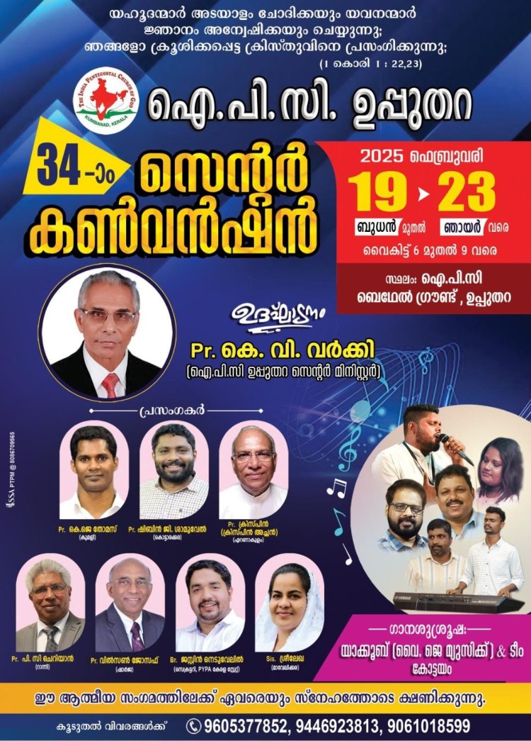 ഉപ്പുതറ : ഇന്ത്യാ പെന്തക്കോസ്ത് ദൈവസഭ 34- മത് ഉപ്പുതറ സെന്റർ കൺവൻഷൻ ഫെബ്രു. 19 മുതൽ 23 ഞായർ വരെ നടക്കും. എല്ലാ ദിവസവും വൈകിട്ട് 6 മുതൽ രാത്രി 9 വരെ ഉപ്പുതറ ഐപിസി ബെഥെൽ ഗ്രൗണ്ടിൽ യോഗങ്ങൾ നടക്കും. പാസ്റ്റർ കെ. വി വർക്കി(ഐപിസി ഉപ്പുതറ സെന്റർ മിനിസ്റ്റർ) ഉദ്ഘാടനം ചെയ്യും. പാസ്റ്റർ കെ. ജെ തോമസ്(കുമളി), പാസ്റ്റർ ഷിബിൻ ജി. ശാമുവേൽ (കൊട്ടാരക്കര), പാസ്റ്റർ ക്രിസ്പിൻ (ക്രിസ്പിൻ അച്ചൻ)എറണാകുളം, പാസ്റ്റർ പി. സി ചെറിയാൻ (റാന്നി), പാസ്റ്റർ വിത്സൻ ജോസഫ് (ഷാർജ), ജെസ്റ്റിൻ നെടുവേലിൽ, സിസ്റ്റർ ശ്രീലേഖ (മാവേലിക്കര ) എന്നിവർ പ്രസംഗിക്കും. യാക്കൂബ് (വൈ. ജെ മ്യുസിക്ക്) & ടീം, കോട്ടയം ഗാനശുശ്രുഷയ്ക്ക് നേതൃത്വം നൽകും.