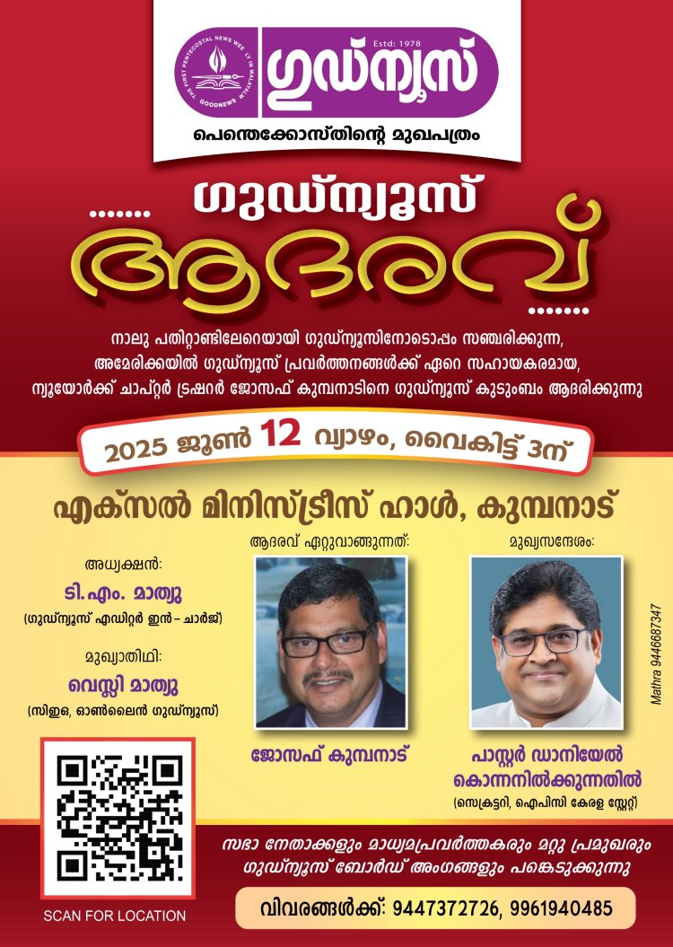 ഗുഡ്ന്യൂസ് എഡിറ്റർ ഇൻചാർജ് ടി.എം. മാത്യു അധ്യക്ഷത വഹിക്കും. ഐപിസി കേരള സ്റ്റേറ്റ് സെക്രട്ടറി പാസ്റ്റർ ഡാനിയേൽ കൊന്നനിൽക്കുന്നതിൽ മുഖ്യസന്ദേശം നൽകും. ഓൺലൈൻ ഗുഡ്ന്യൂസ് സി.ഇ.ഒ വെസ്ലി മാത്യു മുഖ്യാതിഥിയായി പങ്കെടുക്കും. എക്സൽ മിനിസ്ട്രീസ് സംഗീത ശുശ്രൂഷ നയിക്കും. സഭ നേതാക്കളും, മാധ്യമ പ്രവർത്തകരും, മറ്റു പ്രമുഖരും പങ്കെടുക്കും.