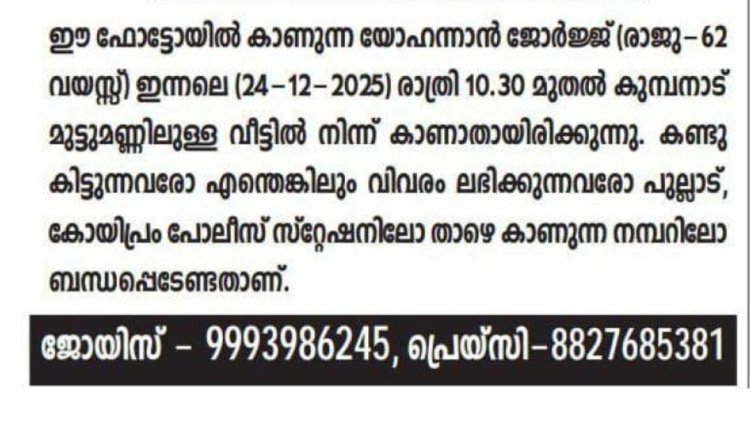 കുമ്പനാട് സ്വദേശിയെ കാൺമാനില്ലെന്ന് പരാതി