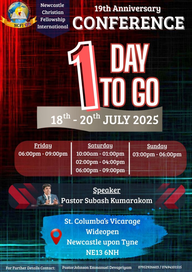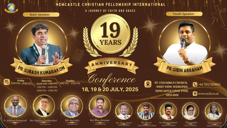 ന്യൂകാസ്റ്റിൽ : ന്യൂകാസ്റ്റിൽ ക്രിസ്ത്യൻ ഫെലോഷിപ്പ് ഇൻ്റർനാഷണൽ സഭയുടെ 19മതു വാർഷിക കോൺഫറൻസ് ജൂലൈ 18 മുതൽ 20 വരെ സെൻ്റ് കൊളമ്പസ് ചർച്ചിൽ നടക്കും.