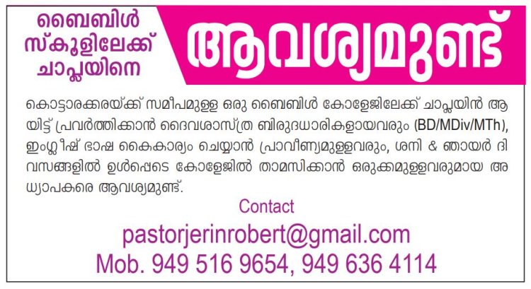 പാസ്റ്ററുടെ മകനും നിലവിൽ പൂർണ്ണ സമയ സഭാ ശുശ്രുഷകനും ബൈബിൾ കോളേജ് അധ്യാപകനുമായി എറണാകുളത്ത് കർത്തൃവേലയിലായിരിക്കുന്ന യുവാവിന് (29 / 6.1"), പൂർണ്ണ സമയ ദൈവവേലയ്ക്ക് വിളിയും സമർപ്പണവുമുള്ള യുവതികളുടെ മാതാപിതാക്കളിൽ നിന്നും വിവാഹാലോചനകൾ ക്ഷണിക്കുന്നു. Contact: +91 85471 73395 (WhatsApp) Email details to: prkjfrancis@gmail.com