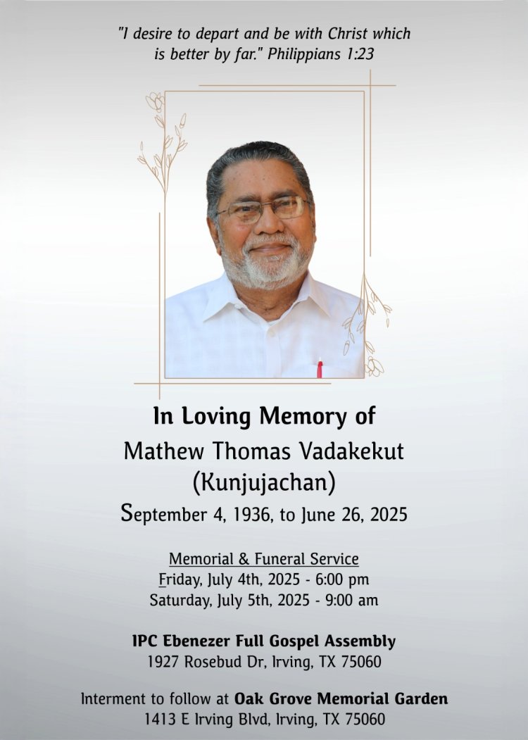 ഡാളസ്: ഗുഡ്ന്യൂസ് സ്ഥാപകാംഗങ്ങളിൽ ഒരാളായ മാത്യു തോമസ് വടക്കേക്കുറ്റ് (കുഞ്ഞൂഞ്ഞച്ചൻ-88) ഡാളസിൽ നിര്യാതനായി.