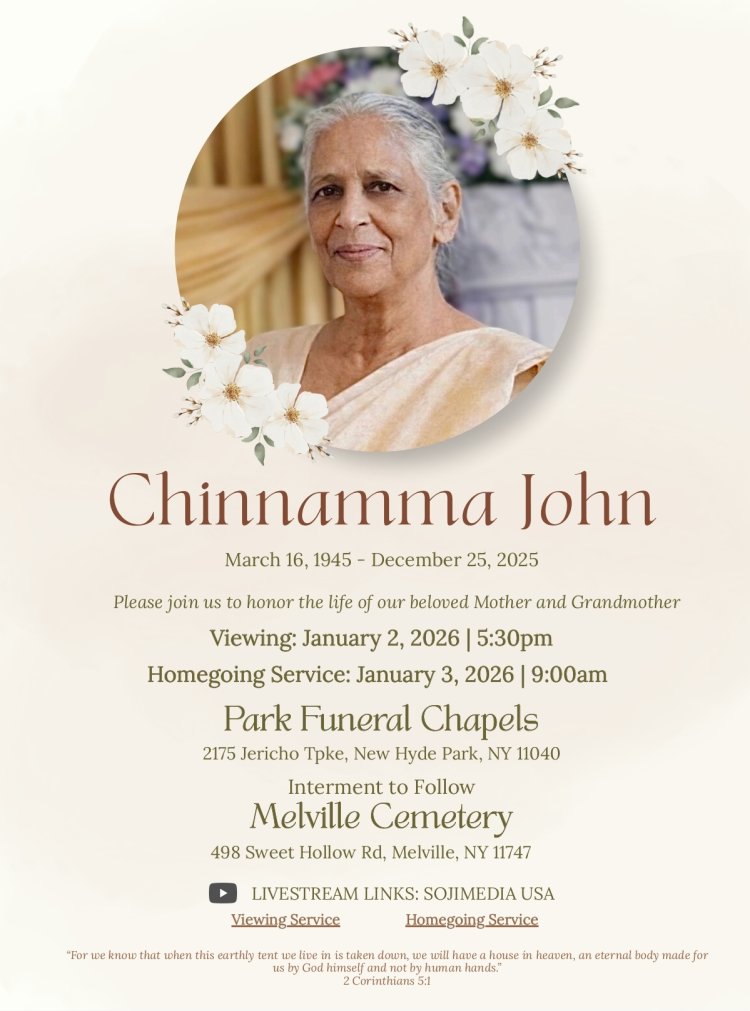 ന്യൂയോർക്ക്: ക്രൈസ്റ്റ് ഏ ജി ന്യൂയോർക്ക് സഭയുടെ സീനിയർ ശുശ്രൂഷകനും കൺവൻഷൻ പ്രസംഗകനുമായ പാസ്റ്റർ ജോർജ് പി ചാക്കോയുടെ ഭാര്യാമാതാവ് ചെങ്ങന്നൂർ പാണ്ടനാട് വൻമഴി വൻകരിമ്പിൽ ചിന്നമ്മ ജോൺ (80) നിര്യാതയായി. സംസ്കാരം ജനു. 3 ന് രാവിലെ 9 ന് Melville Cemetery (498 Sweet Hollow Rd, Melville, NY 11747) നടക്കും. ജനു.2 ന് വൈകിട്ട് 5.30ന് Park Funeral Chapels ( 2175 Jericho Tpke. New Hyderabad Park, NY 11040) പൊതുദർശനം നടക്കും.