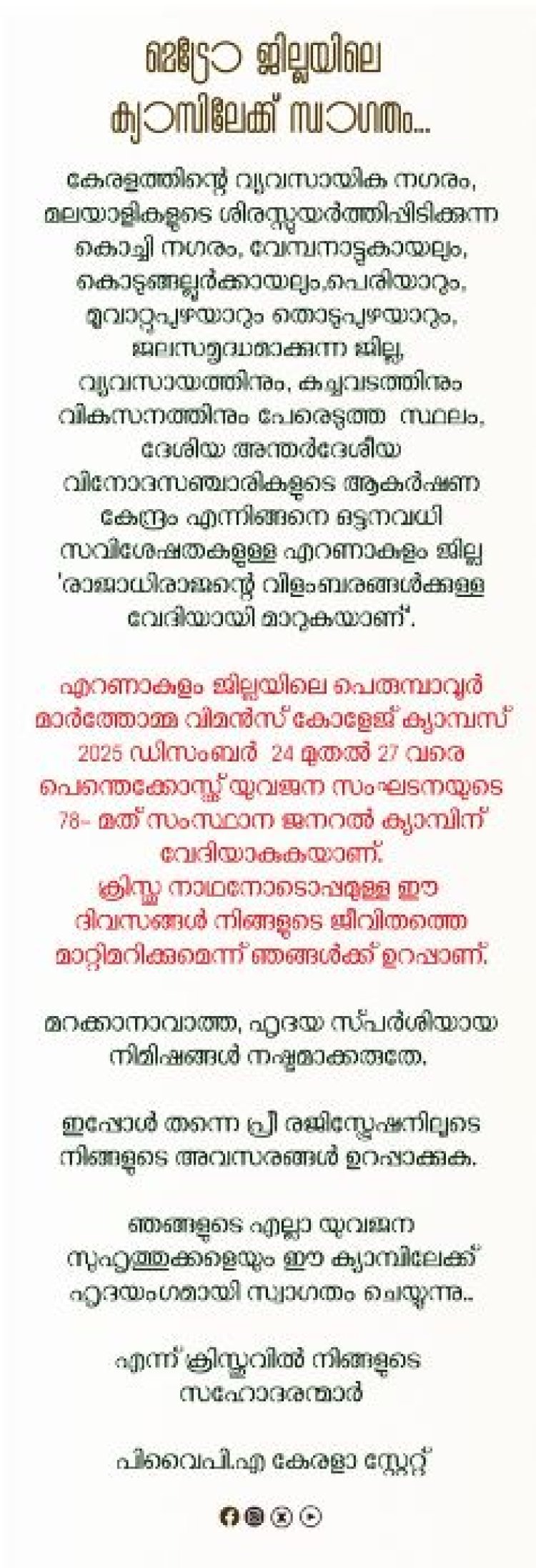 മെട്രോ ജില്ല ഒരുങ്ങി; പി.വൈ.പി.എ. ജനറൽ ക്യാമ്പ് ഡിസം. 24 മുതൽ പെരുമ്പാവൂരിൽ