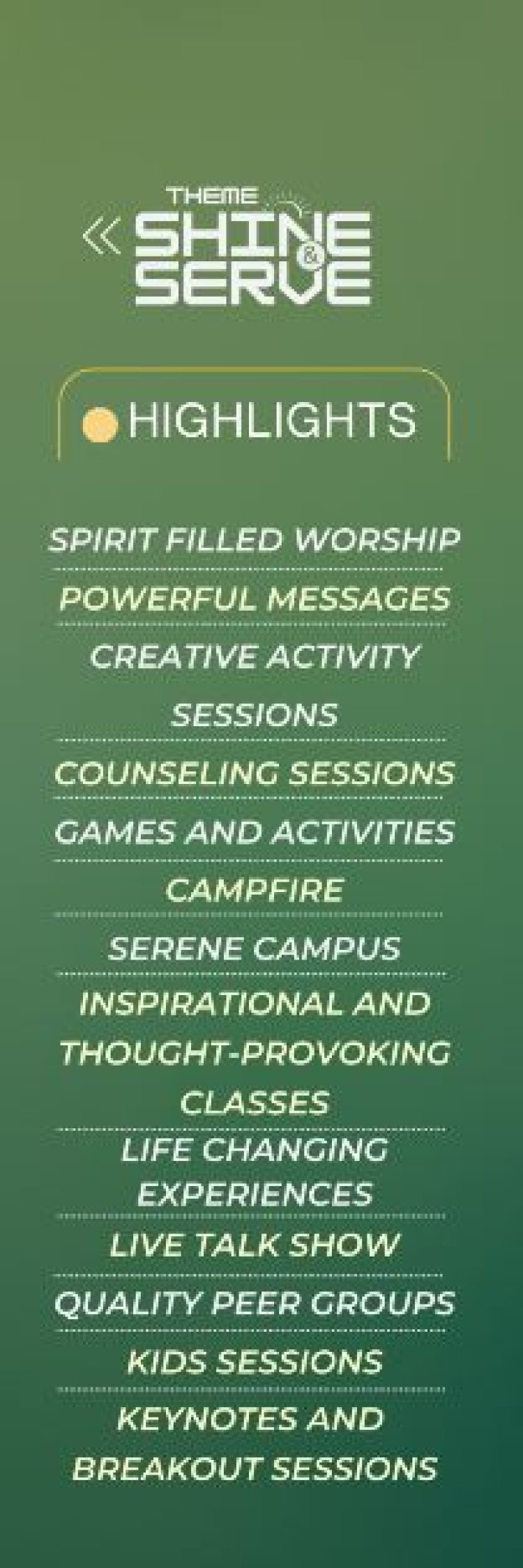 ‘Enroute’ എന്ന് നാമകരണം ചെയ്തിരിക്കുന്ന ക്യാമ്പ് സീരിസിൽ ‘Enroute Season-III’ എന്നാണ് എറണാകുളം ക്യാമ്പിന്റെ ഔദ്യോഗിക പേര്. ‘Shine and Serve’ എന്നതാണ് ക്യാമ്പ് തീം. പേർസണൽ കൗൺസിലിംഗ്, ആക്ടിവിറ്റി ഓറിയന്റ്ഡ് പ്രോഗ്രാംസ്, ലൈവ് വർഷിപ്പ് സെക്ഷനുകൾ, ഗ്രൂപ്പ് ഷെയറിങ് ടൈം, ടാരി മീറ്റിംഗ്, യുവജന സുവിശേഷ റാലി, ക്യാമ്പ് ഫയർ ടാലെന്റ് നൈറ്റ്, എക്സ്ക്ലൂസീവ് ഡിബേറ്റുകൾ, ഔട്ട്ഡോർ ആക്ടിവിറ്റീസ്, കിഡ്സ് സെക്ഷൻ തുടങ്ങിയ ആകർഷണീയമായ സെക്ഷനുകൾ ഉണ്ടായിരിക്കും.