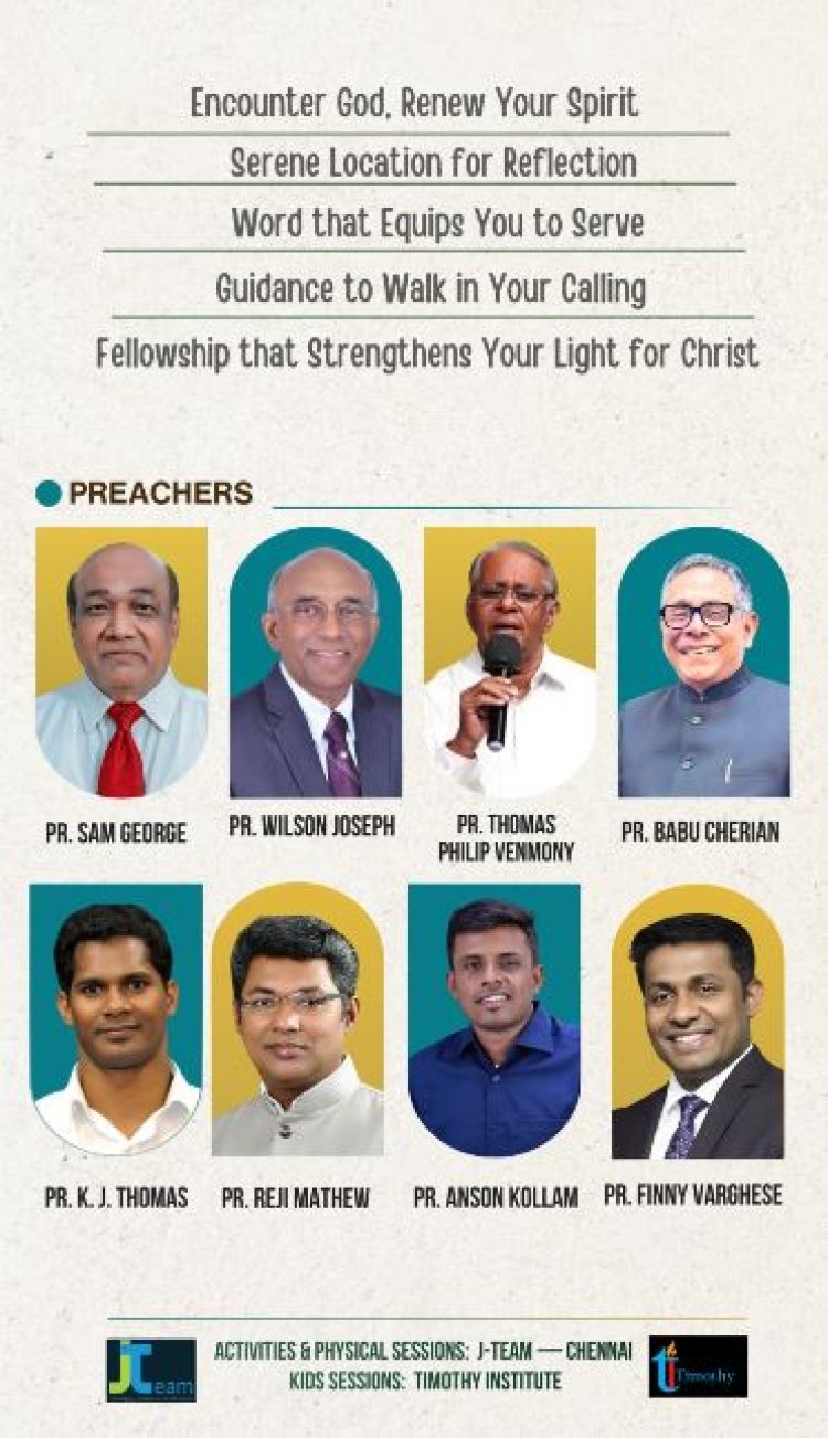 പാസ്റ്റർ റോയ് മാത്യു, ഡോ. റോജി ടി. ജോർജ്, ഡോ. ബിജു ചാക്കോ, ഡോ. നിസി സഖറിയ, ബെൻസിക് മിറാൻഡ, പാസ്റ്റർ ബേബി ജോൺസൻ ഇന്നോവർ ക്യാമ്പ് സെക്ഷനുകൾ നയിക്കും. റിവൈവ് പെരുമ്പാവൂർ എന്ന പേരിൽ നടക്കുന്ന രാത്രി മീറ്റിംഗുകളിൽ പാസ്റ്റർമാരായ സാം ജോർജ്, വിൽസൺ ജോസഫ്, തോമസ് ഫിലിപ്പ് വെണ്മണി, ബാബു ചെറിയാൻ, കെ.ജെ. തോമസ്, രജി മാത്യു, ആൻസൺ കൊല്ലം, ഫിന്നി മാത്യു എന്നിവർ പ്രസംഗിക്കും. പാസ്റ്റർ ഇമ്മാനുവേൽ കോളർ, ഡോ. ബ്ലെസ്സൺ മേമന, പാസ്റ്റർ ലോർഡ്സൺ ആന്റണി, പാസ്റ്റർ അനിൽ അടൂർ, സുജിത് എം. സുനിൽ, ടോം ഫിലിപ്പ്, സാം പൂവച്ചാൽ, ജീസൺ കെ. ജോർജ് എന്നിവർ സംഗീത ശുശ്രൂഷയ്ക്ക് നേതൃത്വം നൽകും.