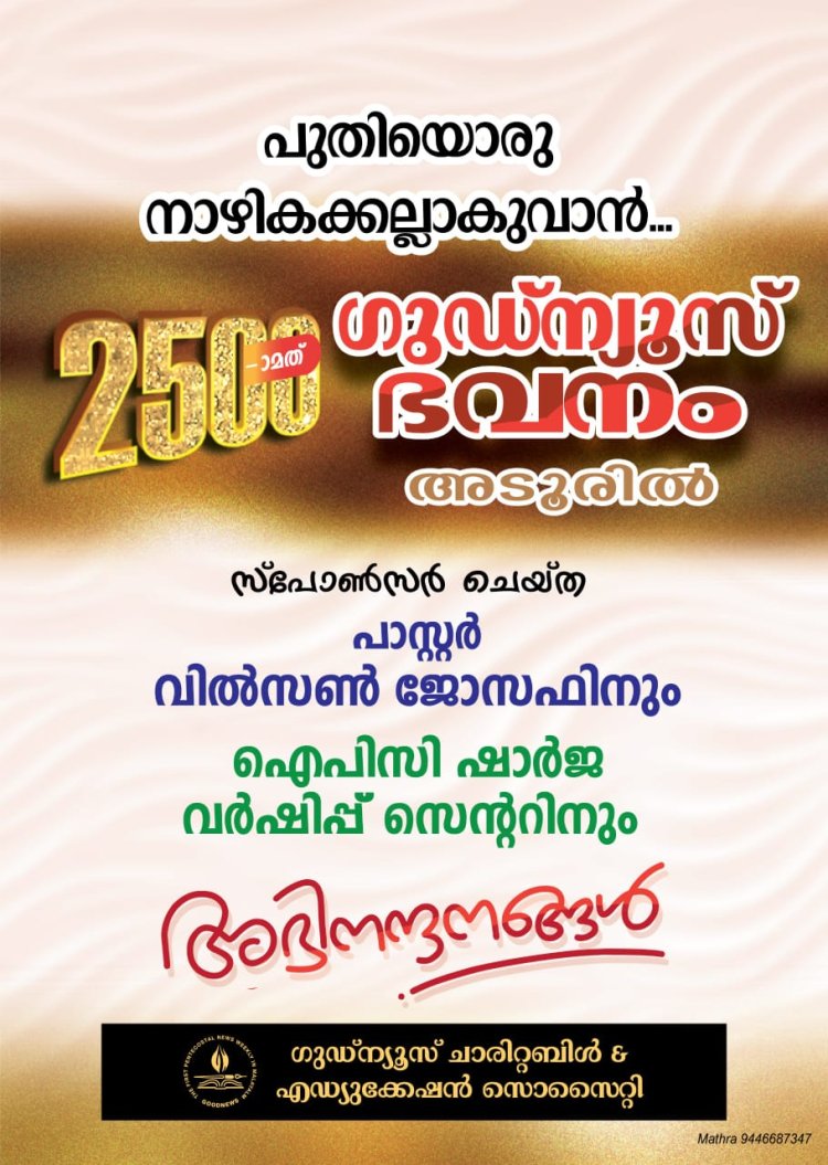 2500-ാമത്തെ ഭവനം സ്പോൺസർ ചെയ്യുന്നത് ഐപിസി മുൻ ജനറൽ വൈസ് പ്രസിഡണ്ട് ഡോ. വിൽസൺ ജോസഫ് നേതൃത്വം നൽകുന്ന ഐ പിസി ഷാർജ വർഷിപ്പ് സെന്ററാണ്. ഐപിസി ഷാർജ വർഷിപ്പ് സെന്റർ കാൽനൂറ്റാണ്ട് പിന്നിടുന്നതിന്റെ ഭാ ഗമായി നിരവധി പ്രവർത്തനങ്ങളാ ണ് ആവിഷ്ക്കരിക്കുന്നത്. 'തലചാ യ്ക്കാനൊരിടം' എന്ന പദ്ധതിയുടെ ഭാഗമായാണ് വർഷിപ്പ് സെന്റർ ഗു ഡ്ന്യൂസിലൂടെ ഭവനം നൽകുന്നത്.