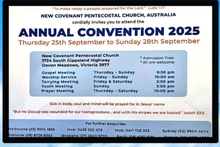 ആസ്ട്രേലിയ: ദി പെന്തെക്കൊസ്ത് മിഷൻ ആസ്ട്രേലിയ സഭയുടെ ന്യൂ കവനൻ്റ് പെന്തെക്കൊസ്തൽ ചർച്ച് കൺവെൻഷൻ സെപ്റ്റം.25 വ്യാഴം മുതൽ 28 ഞായർ വരെ വിക്ടോറിയ, സൗത്ത് ജിപ്സ്ലാൻഡ് ഹൈവേ, ഡെവൻ മെഡോസിലുള്ള ന്യൂ കവനൻ്റ് പെന്തെക്കൊസ്തൽ ചർച്ച് ഹാളിൽ നടക്കും.
