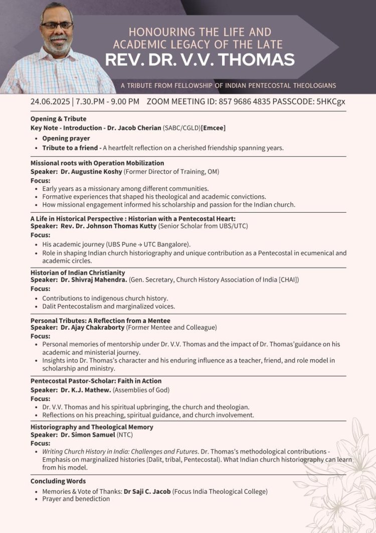 ഡോ.വി.വി തോമസിന്റെ ജീവിതത്തെയും അക്കാദമിക് പൈതൃകത്തെയും ആദരിക്കുന്ന ഈ സമ്മേളനത്തിൽ ഡോ. വി വി തോമസുമായി ചേർന്ന് പ്രവർത്തിച്ച ഇന്ത്യൻ ദൈവശാസ്ത്രമേഖലയിൽ നിന്നുള്ള അധ്യാപകരും ശുശ്രുഷകരും ഓർമ്മകൾ പങ്കുവയ്ക്കും. FIPT ഭാരവാഹികൾ നേതൃത്വം നൽകും.