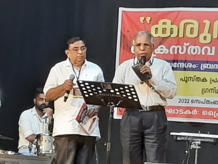 ക്രൈസ്തവ സാഹിത്യ അക്കാദമി തൃശൂരിൽ നടത്തിയ 'കരുതുന്നവൻ' സംഗീത സായാഹ്നത്തിൽ ജോർജ് പീറ്റർ ചിറ്റൂർ പ്രസംഗിക്കുന്നു. പ്രസിഡൻ്റ് ടോണി ഡി. ചെവ്വൂക്കാരൻ സമീപം