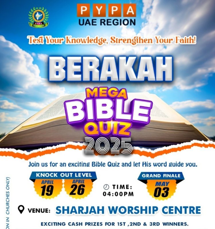ഷാർജ: പിവൈപിഎ. യുഎഇ റീജിയന്റെ നേതൃത്വത്തിൽ മെഗാ ബൈബിൾ ക്വിസ് "ബറകാ" ഏപ്രിൽ 19 ന് ഷാർജ വാർഷിപ് സെന്ററിൽ ആരംഭിക്കും. മൂന്ന് ഘട്ടങ്ങളായി ക്രമീകരിച്ചിരിക്കുന്ന നോക്ക്ഔട്ട് മത്സരങ്ങൾ ഏപ്രിൽ 19, 26 തീയതികളിലും, ഗ്രാൻഡ് ഫിനാലെ മെയ് 3 നും നടക്കും. വിജയികൾക്ക് ക്യാഷ് അവാർഡുകൾ നൽകി ആദരിക്കും. പിവൈപിഎ. റീജിയൻ ഭാരവാഹികളുടെ നേതൃത്വത്തിൽ വിപുലമായ ക്രമീകരണങ്ങൾ നടന്നു വരുന്നു.