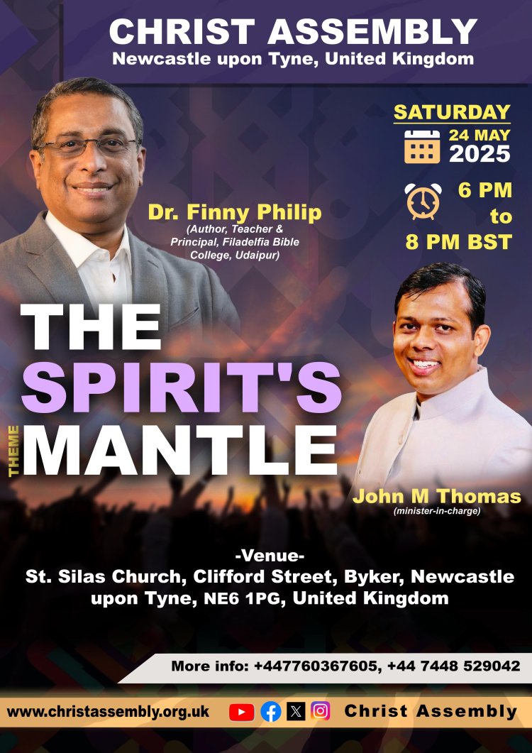 യു.കെ.: ന്യൂകാസിൽ ക്രൈസ്റ്റ് അസംബ്ലി സഭയുടെ സ്പെഷ്യൽ മീറ്റിങ്ങ് "ദി സ്പിരിറ്റ്സ് മാൻ്റിൽ" മെയ് 24 നാളെ വൈകുന്നേരം 6 മുതൽ ബൈക്കർ ക്ലിഫോർഡ് സ്ട്രീറ്റിലുള്ള സെൻ്റ് ശീലാസ് ചർച്ചിൽ നടക്കും.