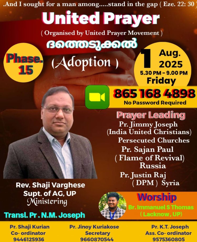 പാറ്റ്ന: ഭാരതത്തിലെ വിവിധ പ്രാർത്ഥന മൂവ്മെന്റുകളെ ഏകോപിപ്പിച്ചുകൊണ്ട് ഓഗ.1 ന് വെള്ളിയാഴ്ച വൈകുന്നേരം 5.30 മുതൽ 9 വരെ ഐക്യ പ്രാർത്ഥന നടക്കും. റവ ഷാജി വർഗീസ് (സൂപ്രണ്ട്, എ ജി ചർച്ച്, യുപി) പ്രസംഗിക്കും. ജിമ്മി ജോസഫ്, സാജൻ പോൾ, ജസ്റ്റിൻ രാജ് നേതൃത്വം നല്കും