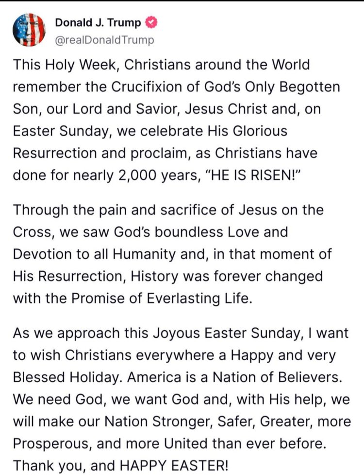 “ഭൂമിയിലെ തന്റെ അവസാന മണിക്കൂറുകളിൽ, തന്റെ എല്ലാ സൃഷ്ടികളോടും ഉള്ള ആഴമേറിയതും നിലനിൽക്കുന്നതുമായ സ്നേഹത്തിൽ നിന്ന് ക്രിസ്തു, മനസ്സോടെ വേദനയും പീഡനവും കുരിശിലെ വധശിക്ഷയും സഹിച്ചു. അവന്റെ കഷ്ടപ്പാടിലൂടെ നമുക്ക് വീണ്ടെടുപ്പുണ്ട്. അവന്റെ മരണത്തിലൂടെ നമ്മുടെ പാപങ്ങൾ ക്ഷമിക്കപ്പെട്ടിരിക്കുന്നു". "അവന്റെ പുനരുത്ഥാനത്തിലൂടെ നമുക്ക് നിത്യജീവന്റെ പ്രത്യാശയുണ്ട്. ഈസ്റ്റർ രാവിലെ, കല്ല് ഉരുട്ടിമാറ്റപ്പെടുന്നു, ശവകുടീരം ശൂന്യമാണ്, ഇരുട്ടിനു മുകളിൽ വെളിച്ചം പ്രബലമാകുന്നു - മരണത്തിന് അവസാന വാക്ക് ഇല്ലെന്ന് ഇത് സൂചിപ്പിക്കുന്നു." ഈ ആഴ്ച, നമ്മുടെ പ്രിയപ്പെട്ട രാഷ്ട്രത്തിന്മേൽ പരിശുദ്ധാത്മാവിന്റെ ഒഴുക്കിനായി നാം പ്രാർത്ഥിക്കുന്നു. അമേരിക്ക മുഴുവൻ ലോകത്തിനും വിശ്വാസത്തിന്റെയും പ്രത്യാശയുടെയും സ്വാതന്ത്ര്യത്തിന്റെയും ഒരു ദീപസ്തംഭമായി തുടരട്ടെ എന്നും ക്രിസ്തുവിന്റെ നിത്യ സ്വർഗ്ഗരാജ്യത്തിന്റെ സത്യം, സൗന്ദര്യം, നന്മ എന്നിവ പ്രതിഫലിപ്പിക്കുന്ന ഒരു ഭാവി കൈവരിക്കട്ടെ എന്നും ഞങ്ങൾ പ്രാർത്ഥിക്കുന്നു," ട്രംപ് തുടർന്നു. ട്രംപിന്റെ വിശുദ്ധവാര സന്ദേശത്തിൽ ഗർഭഛിദ്രം, മതസ്വാതന്ത്ര്യം എന്നിവയുൾപ്പെടെയുള്ള സമകാലിക വിഷയങ്ങളിൽ തൻ്റെ ഗവൺമെൻ്റിൻ്റെ പ്രതിബന്ധതയും ചൂണ്ടി കാട്ടുന്നുണ്ട്. "ഈ വിശുദ്ധവാരത്തിൽ, നമ്മുടെ സ്കൂളുകളിലും, സൈന്യത്തിലും, ജോലിസ്ഥലങ്ങളിലും, ആശുപത്രികളിലും, ഗവൺമെന്റിന്റെ ഹാളുകളിലും ക്രിസ്തീയ വിശ്വാസം സംരക്ഷിക്കുമെന്ന വാഗ്ദാനം എന്റെ ഭരണകൂടം പുതുക്കുന്നു. മതസ്വാതന്ത്ര്യത്തിനുള്ള അവകാശം സംരക്ഷിക്കുന്നതിലും, ജീവിതത്തിന്റെ അന്തസ്സ് ഉയർത്തിപ്പിടിക്കുന്നതിലും, നമ്മുടെ പൊതു ഇടങ്ങളിൽ ദൈവത്തെ സംരക്ഷിക്കുന്നതിലും ഞങ്ങൾ ഒരിക്കലും പതറുകയില്ല എന്ന ഉറപ്പും നൽകുന്നതായി തൻ്റെ സന്ദേശത്തിൽ പ്രസിഡൻ്റ് ട്രമ്പ് പറഞ്ഞു.