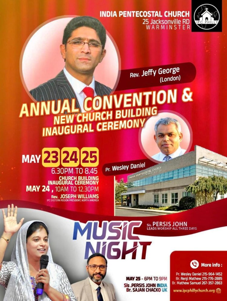 ഫിലഡല്ഫിയ: 1990ല് ഇന്ത്യാക്കാര് തിങ്ങിപ്പാര്ക്കുന്ന ഫിലഡല്ഫിയാ പട്ടണത്തില് പാസ്റ്റര് വെസ്ലി ഡാനിയേല് ആരംഭിച്ച ഐപിസി ചര്ച്ച് ഓഫ് ഗോഡ് (25 ജക്സണ് റോഡ്, വാര്മിനിസ്റ്റര്, ഫിലാഡല്ഫിയാ, യു.എസ്.എ) സഭയുടെ പുതിയതായി വാങ്ങിയ ആരാധനാലയത്തിന്റെ ഉത്ഘാടനവും കൺവൻഷനും മെയ് 23 മുതൽ 25 വരെ നടക്കും.