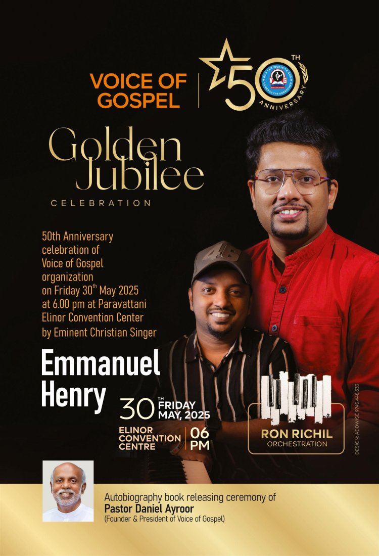 പ്രശസ്ത ക്രൈസ്തവ ഗായകൻ ഇമ്മാനുവേൽ ഹെൻട്രി നയിക്കുന്ന ഗാനശുശ്രൂഷയും പ്രസിഡൻ്റ് പാസ്റ്റർ ദാനിയേൽ ഐരൂരിൻ്റെ ആത്മകഥയുടെ പ്രകാശനവും നടക്കും.