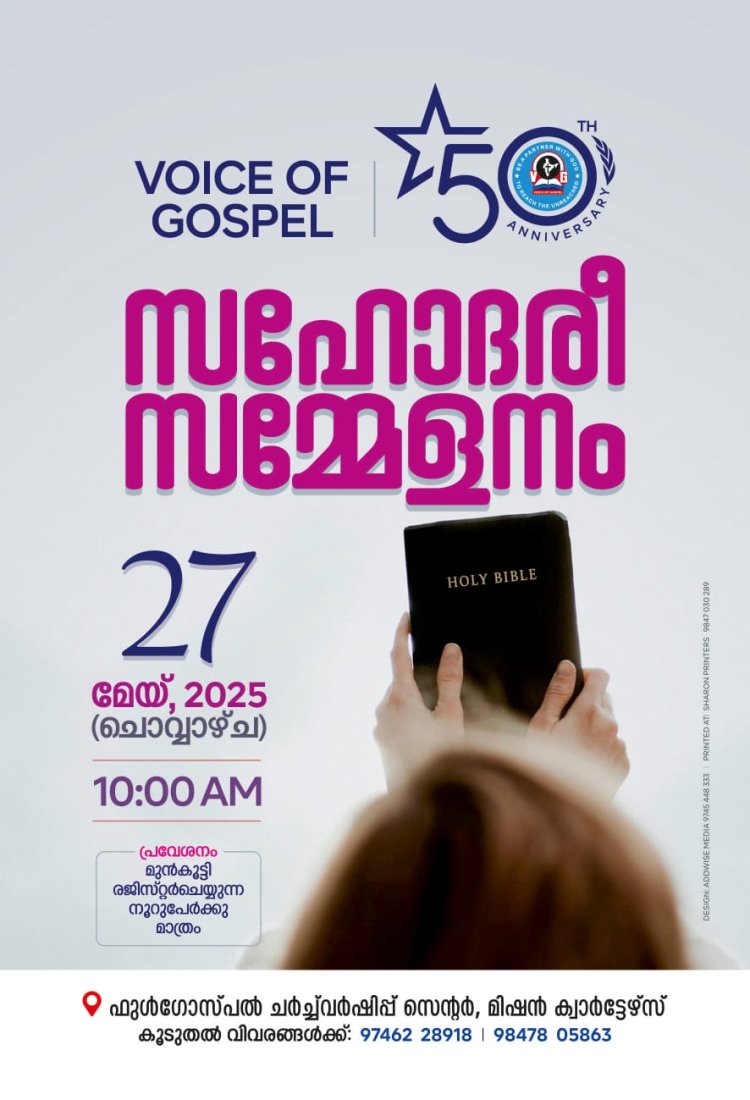 തൃശൂർ: അരനൂറ്റാണ്ടായി തൃശൂർ കേന്ദ്രമാക്കി പ്രവർത്തിക്കുന്ന വോയ്സ് ഓഫ് ഗോസ്പൽ എന്ന സംഘടനയുടെ ഗോൾഡൻ ജൂബിലി സമ്മേളനവും ആത്മീയ സംഗമവും മെയ് 30 ന് പറവട്ടാനി എലിനോർ കൺവൻഷൻ സെൻ്ററിൽ വൈകിട്ട് ആറിന് നടക്കും.